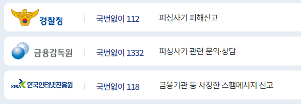 경찰청 112, 금융감독원 1332, 한국인터넷진흥원 118 등 여러 통로가 있지만 온라인 신고 일원화로 통합 112 신고
