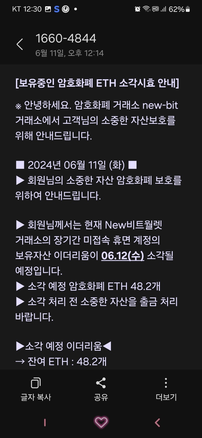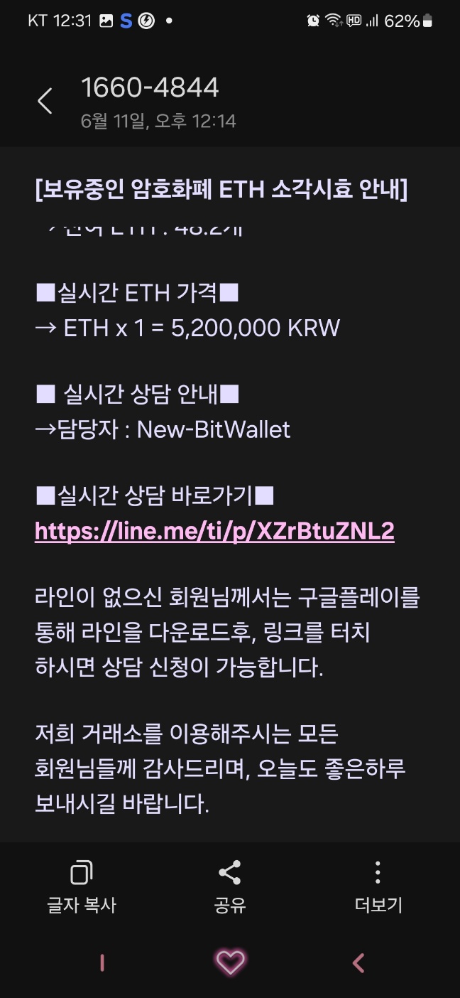 암호화폐 소멸안내 문자 조심