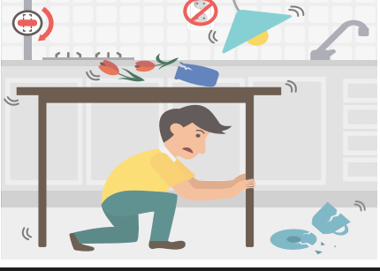 ■ 집안에 있을 경우 - 지진발생으로 흔들리면 탁자나 책상아래로 들어가 몸을 잠시 보호하다가 흔들림이 일시적으로 멈추면 전기와 가스를 차단하고 문을 열어 확보된 출구를 통해 밖으로 나간다. 이때 계단을 이용한다.